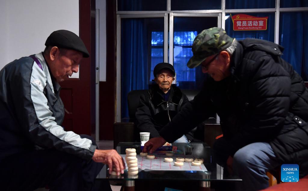 Residents stricken by the flood play Chinese chess at a temporary relocation site in Dali County of Weinan City, northwest China's Shaanxi Province, Oct. 11, 2021. Nearly 240,000 people were affected by the floods due to continuous downpours in Dali County of Shaanxi Province. So far, more than 25,000 people have been evacuated to temporary relocation sites offering accommodation and medical services. (Xinhua/Liu Xiao)