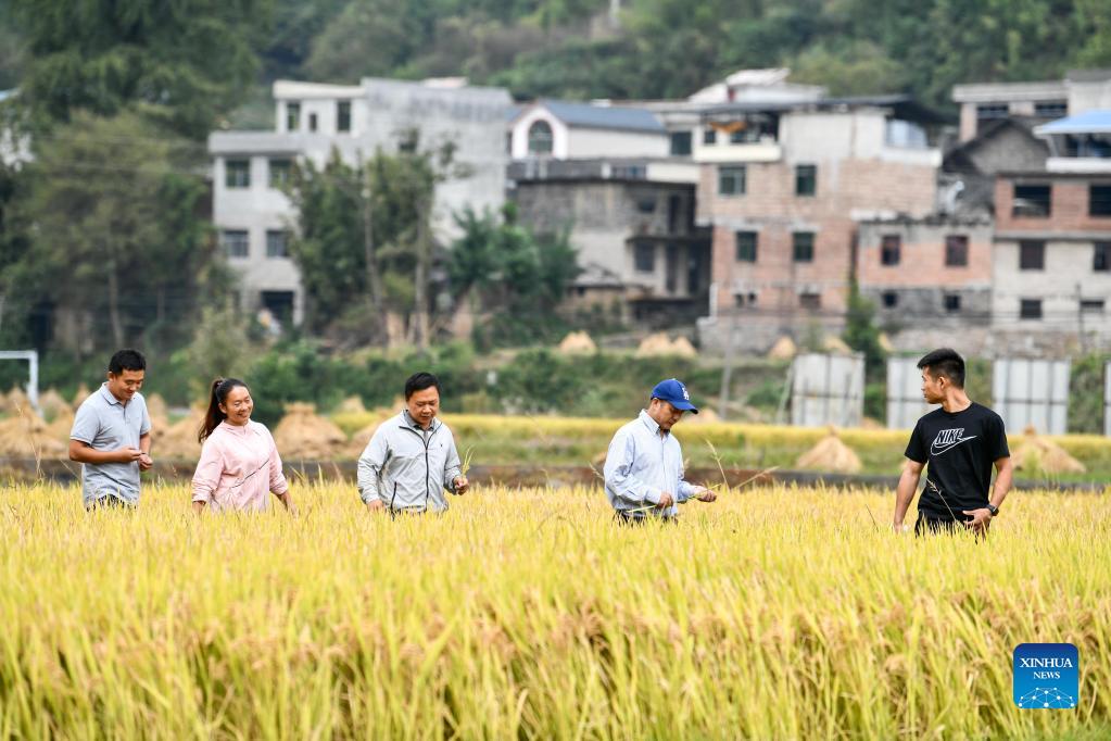 Zhao Xiangrong (3rd L) and his wife (2nd L) walk in a paddy field in Leping Village of Majiang County, southwest China's Guizhou Province, Oct. 8, 2021. Zhao Xiangrong, a former truck driver and a chef, returned to his hometown in Guizhou and started planting rice in 2015. Supported and guided by local government and experts, Zhao has developed skills in cultivating rice containing zinc, selenium and other microelement. After six years of hard work, Zhao has accumulated rich experience in sowing seeds, managing field, as well as processing, transportation and storage of rice. The rice planting area of Zhao Xiangrong reached nearly 300 mu (20 hectares) this year, and his high-quality rice has gained great reputation in many provinces of China. Zhao has vigorously shared his experience with fellow villagers and is willing to make further contribution to the development of local rice industry and rural revitalization. (Xinhua/Yang Wenbin)