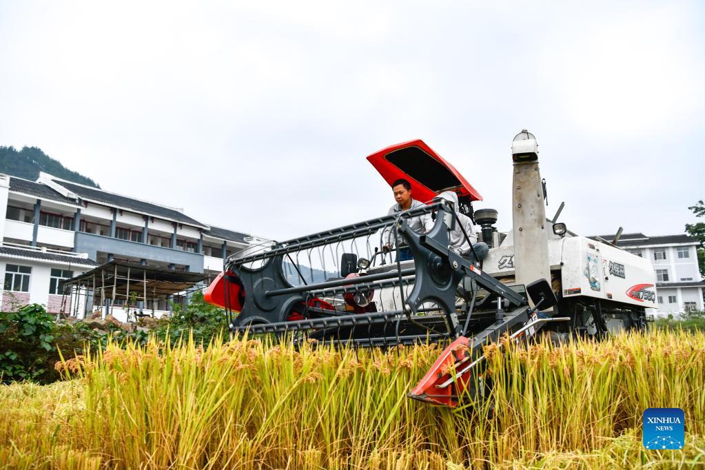 Zhao Xiangrong (L) harvests paddy rice in Leping Village of Majiang County, southwest China's Guizhou Province, Oct. 8, 2021. Zhao Xiangrong, a former truck driver and a chef, returned to his hometown in Guizhou and started planting rice in 2015. Supported and guided by local government and experts, Zhao has developed skills in cultivating rice containing zinc, selenium and other microelement. After six years of hard work, Zhao has accumulated rich experience in sowing seeds, managing field, as well as processing, transportation and storage of rice. The rice planting area of Zhao Xiangrong reached nearly 300 mu (20 hectares) this year, and his high-quality rice has gained great reputation in many provinces of China. Zhao has vigorously shared his experience with fellow villagers and is willing to make further contribution to the development of local rice industry and rural revitalization. (Xinhua/Yang Wenbin)