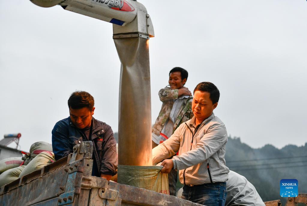 Zhao Xiangrong (R, front) packs harvested paddy rice with workers in Leping Village of Majiang County, southwest China's Guizhou Province, Oct. 8, 2021. Zhao Xiangrong, a former truck driver and a chef, returned to his hometown in Guizhou and started planting rice in 2015. Supported and guided by local government and experts, Zhao has developed skills in cultivating rice containing zinc, selenium and other microelement. After six years of hard work, Zhao has accumulated rich experience in sowing seeds, managing field, as well as processing, transportation and storage of rice. The rice planting area of Zhao Xiangrong reached nearly 300 mu (20 hectares) this year, and his high-quality rice has gained great reputation in many provinces of China. Zhao has vigorously shared his experience with fellow villagers and is willing to make further contribution to the development of local rice industry and rural revitalization. (Xinhua/Yang Wenbin)