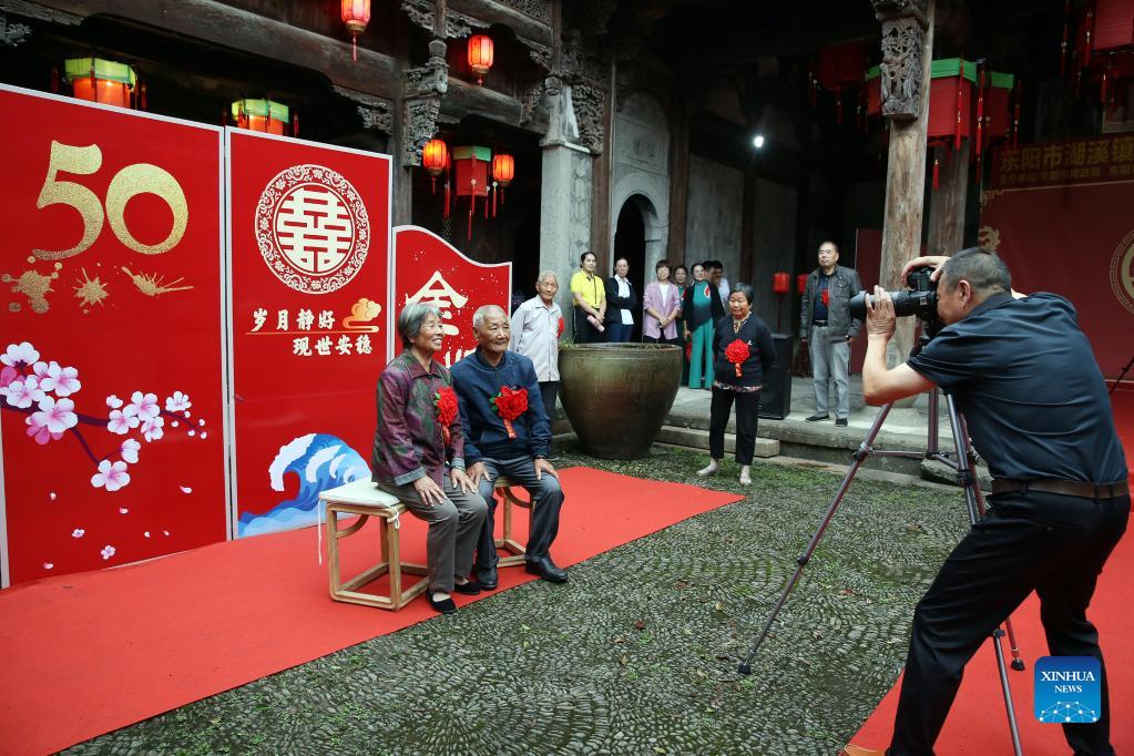 A photographer takes a picture for an elderly couple celebrating their golden wedding anniversary in Zhenxi Village of Dongyang City, east China's Zhejiang Province, Oct. 12, 2021. The Double Ninth Festival or the Chongyang Festival is approaching. A series of celebration activities were held across the country. (Photo by Hu Yanghui/Xinhua)