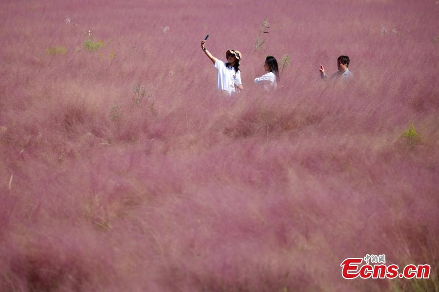Women take selfie in a field of pink grass (muhlenbergia capillaris) in Nanjing, capital of east China's Jiangsu Province, Oct.12, 2021. Muhly grasses create pink mist attracting many tourists. (Photo/China News Service)