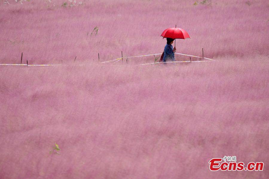 Photo shows a woman walking in a field of pink grass (muhlenbergia capillaris) in Nanjing, capital of east China's Jiangsu Province, Oct. 12, 2021. Muhly grasses create pink mist attracting many tourists. (Photo/China News Service)
