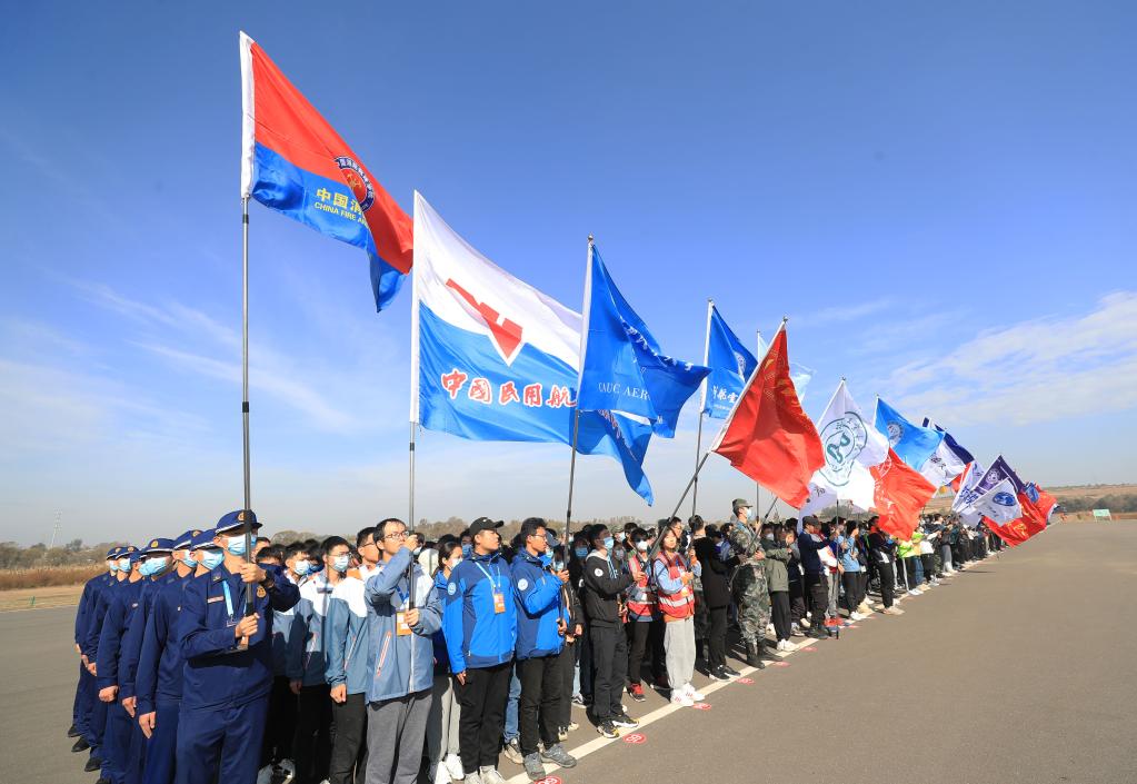 Teams participate in the opening ceremony of the China International Aircraft Design Challenge final in Fuxin, northeast China's Liaoning Province, Oct. 13, 2021. The final of 2021 China International Aircraft Design Challenge kicked off here on Wednesday. More than 1700 competitors from about 70 universities attended the final. (Xinhua/Yang Qing)