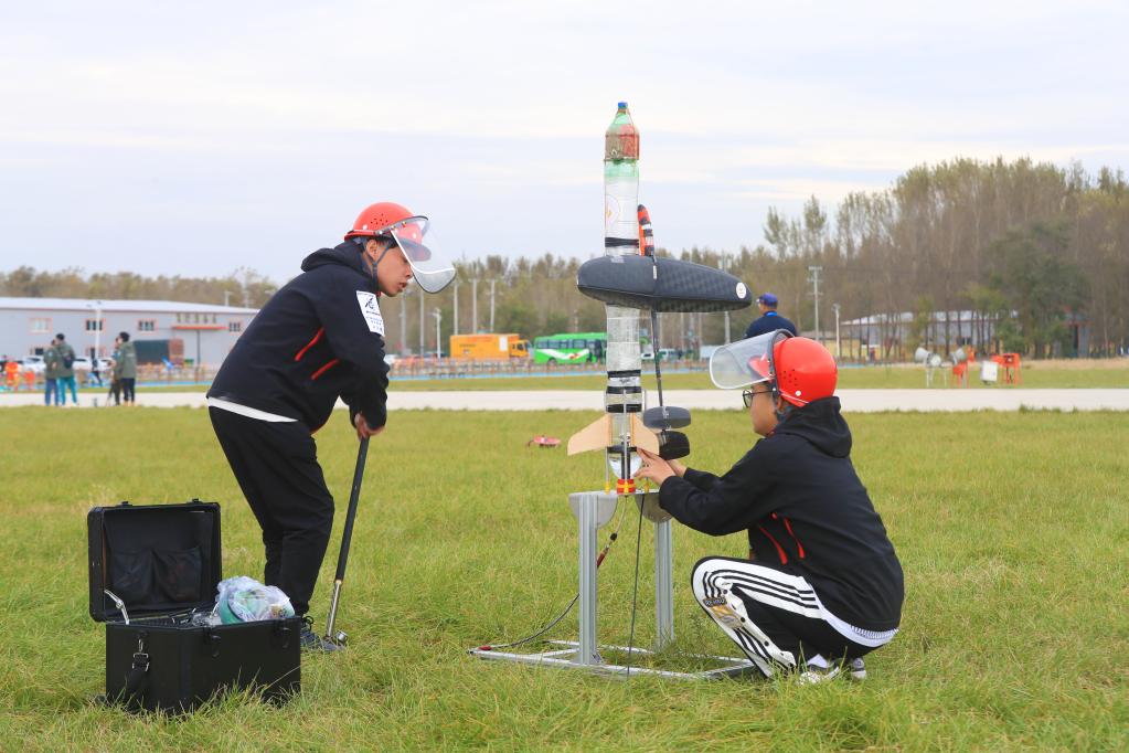 Competitors prepare their aircraft model during the final of the China International Aircraft Design Challenge in Fuxin, northeast China's Liaoning Province, Oct. 13, 2021. The final of 2021 China International Aircraft Design Challenge kicked off here on Wednesday. More than 1700 competitors from about 70 universities attended the final. (Xinhua/Yang Qing)