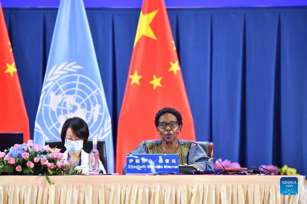 Elizabeth Maruma Mrema, executive secretary of the Convention on Biological Diversity, addresses the closing plenary of the High-Level Segment of the first part of the 15th meeting of the Conference of the Parties to the Convention on Biological Diversity (COP15) in Kunming, southwest China's Yunnan Province, Oct. 13, 2021. (Xinhua/Li Xin)