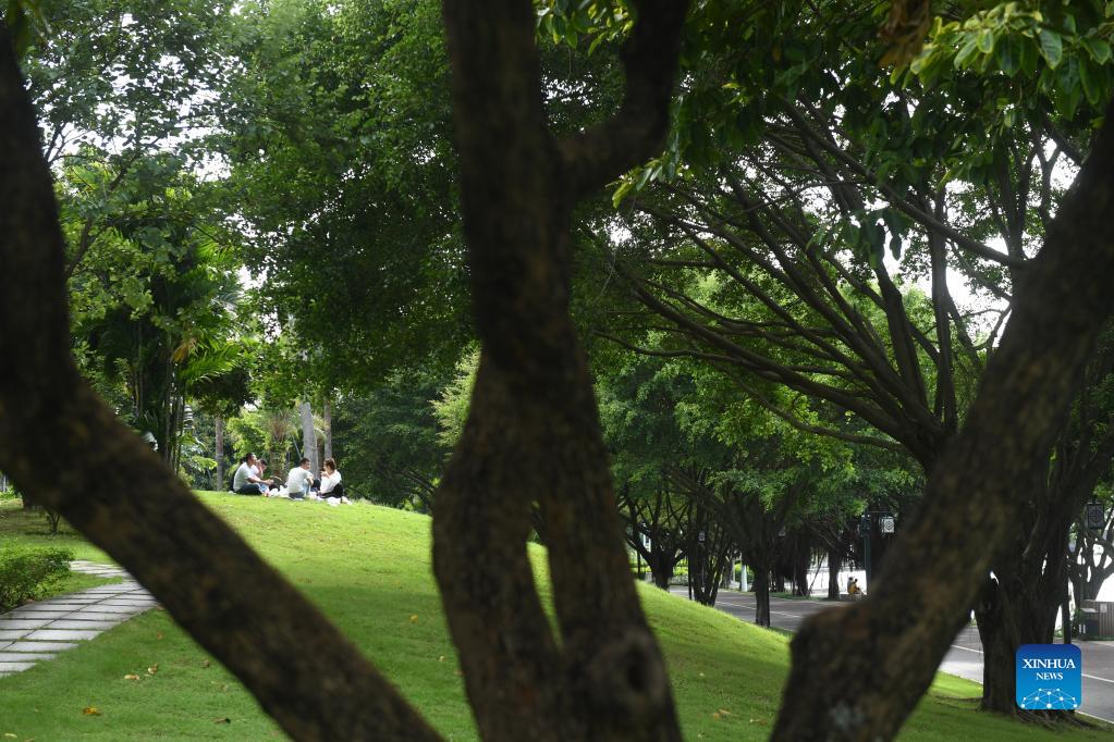 Citizens have fun on a grassland by Nanhu Lake in Nanning, capital of south China's Guangxi Zhuang Autonomous Region, Oct. 12, 2021. (Xinhua/Lu Boan)
