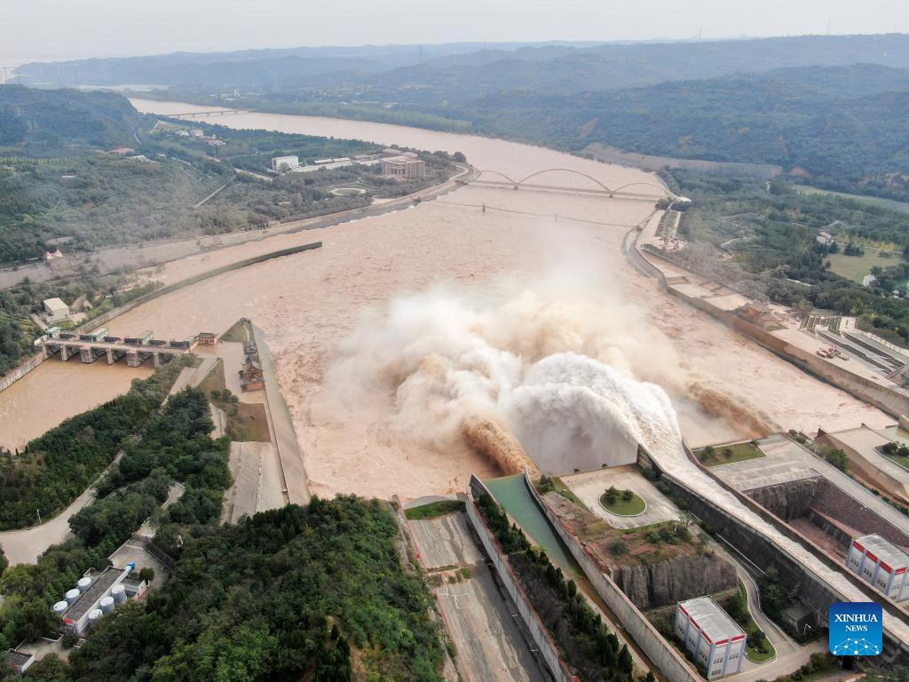 Aerial photo taken on Oct. 12, 2021 shows water gushing out from sluiceways of the Xiaolangdi Reservoir on the Yellow River in central China's Henan Province. Due to continuous rainfall, the Yellow River has seen three floods since Sept. 27. The water level of the Xiaolangdi Reservoir on Oct. 9 reached a record high of 273.5 meters since the dam was built. (Xinhua/Shang Kunlun)