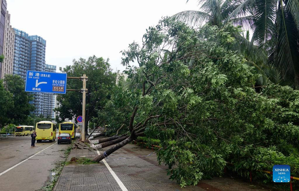 Fallen trees destroyed by typhoon Kompasu are seen in Haikou, capital of south China's Hainan Province, Oct. 13, 2021. Typhoon Kompasu, the 18th typhoon of this year, made landfall in south China's island province of Hainan on Wednesday afternoon. (Xinhua/Yang Guanyu)