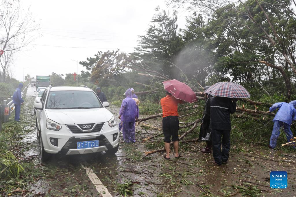 Workers clean up fallen trees destroyed by typhoon Kompasu in Shangen Township of Wanning city, south China's Hainan Province, Oct. 13, 2021. Typhoon Kompasu, the 18th typhoon of this year, made landfall in south China's island province of Hainan on Wednesday afternoon. (Xinhua/Zhang Liyun)