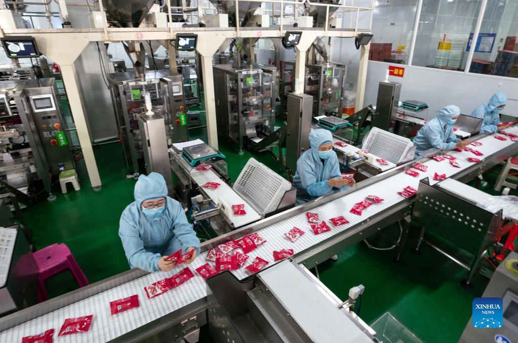Workers process winter jujube products at a factory in Huanghua City, north China's Hebei Province, Oct. 12, 2021. Known as the home of winter jujube, Huanghua City sees an effective increase in local people's income in recent years as the local government made great efforts in expanding the winter jujube sales channels and strengthening the winter jujube processing chain. (Xinhua/Luo Xuefeng)