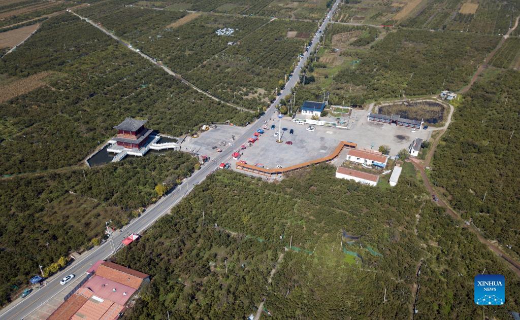 Aerial photo taken on Oct. 12, 2021 shows a view of winter jujube orchard in Huanghua City, north China's Hebei Province. Known as the home of winter jujube, Huanghua City sees an effective increase in local people's income in recent years as the local government made great efforts in expanding the winter jujube sales channels and strengthening the winter jujube processing chain. (Xinhua/Luo Xuefeng)