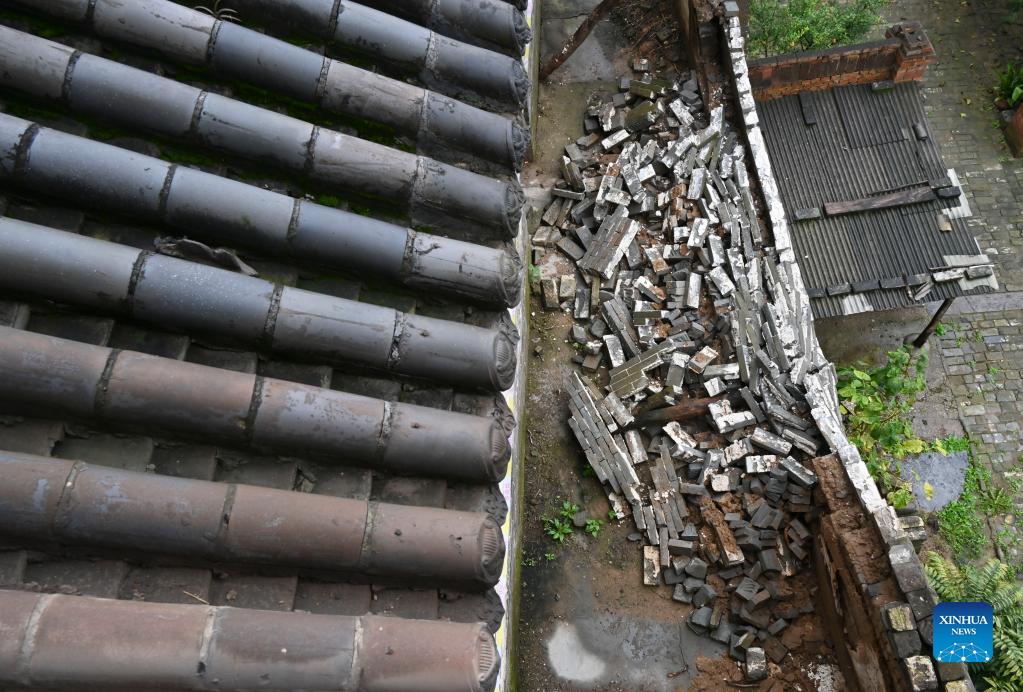 Photo taken on Oct. 12, 2021 shows the collapsed wall at a cultural relic site in Xiangfen County of Linfen City, north China's Shanxi Province. A total of 1,763 cultural relic sites in north China's Shanxi Province are under repair as of noon on Sunday due to heavy downpours, the provincial cultural relics bureau said on Monday. (Xinhua/Ma Yimin)