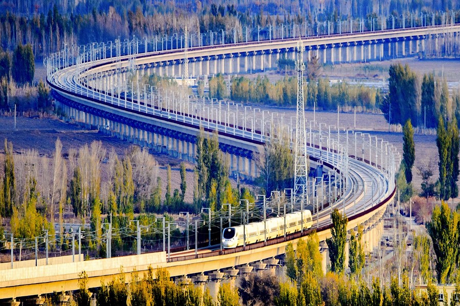 File photo shows a bullet train running through a bridge on the Lanzhou-Xinjiang high-speed railway, northwest China's Xinjiang Uygur Autonomous Region. (Xinhua/Cai Zengle)