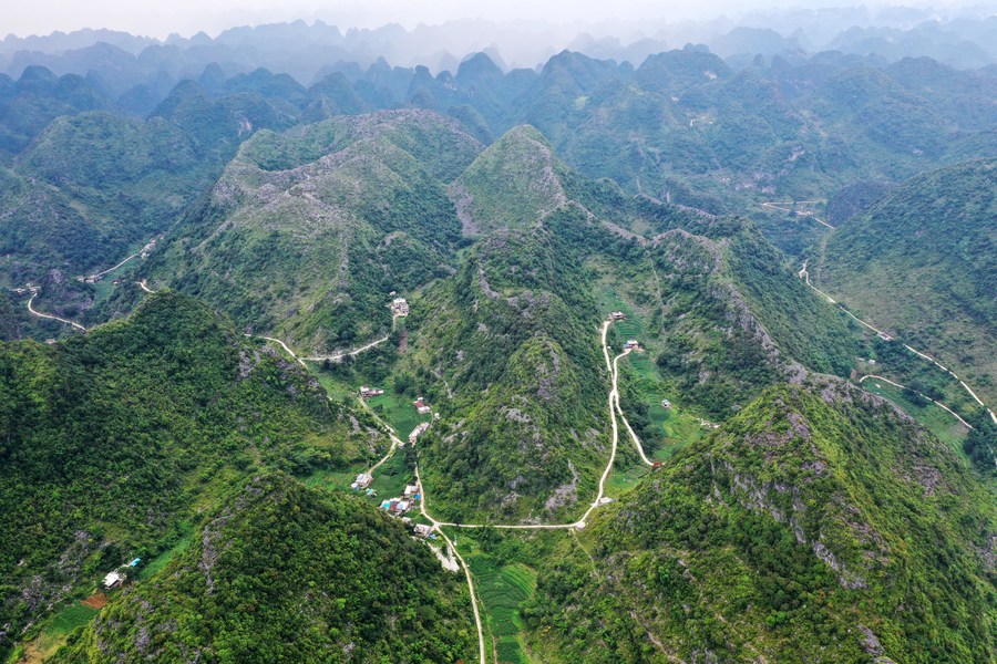 Aerial photo taken on Sept. 1, 2021 shows mountain roads in Jiahe Village, Jingsheng Township of Du'an Yao Autonomous County, south China's Guangxi Zhuang Autonomous Region. Du'an is known as the "rocky kingdom" as 89 percent of its administrative region is covered by karst mountains. (Xinhua/Lu Boan)