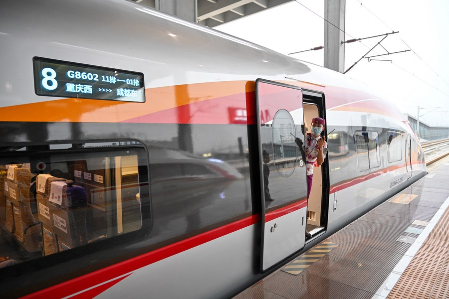 Train G8602, a Fuxing intelligent bullet train, is seen at Chongqing West Railway Station in Chongqing, southwest China, June 25, 2021.(Photo by Bao Liang/Xinhua)