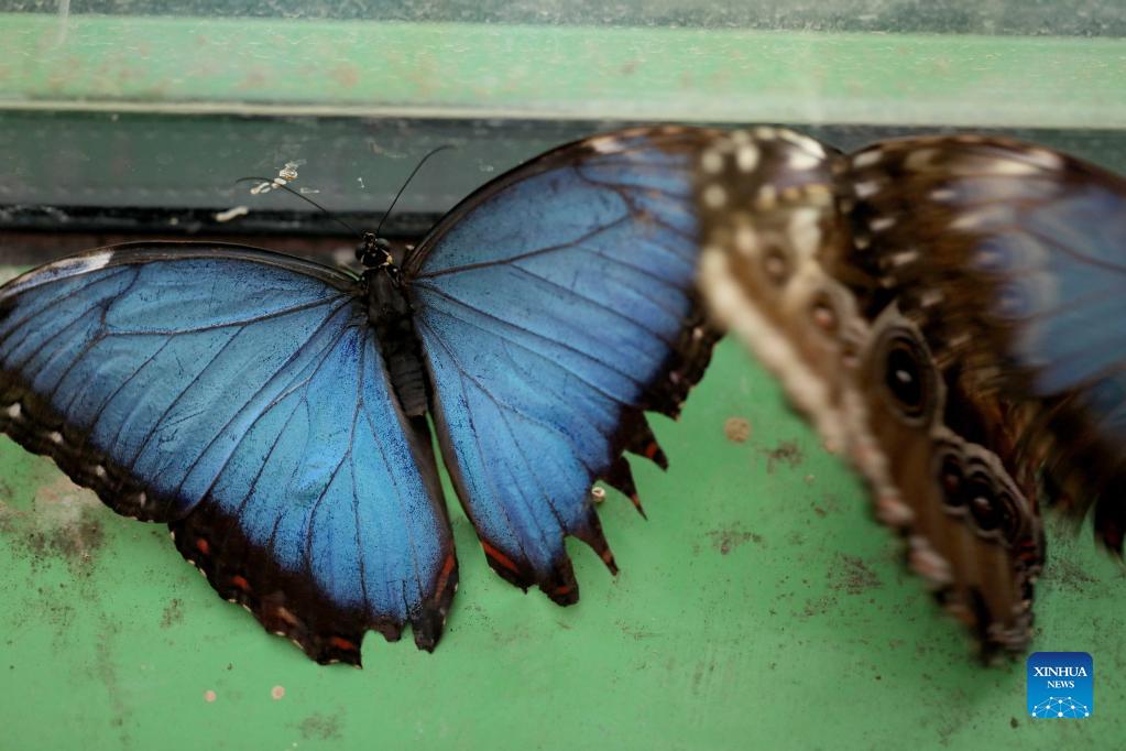 Blue morpho butterflies are seen at a zoo in Jerusalem on Oct. 12, 2021. An exhibition stepping into the world of butterflies opened this month at the zoo. (Photo by Gil Cohen Magen/Xinhua)