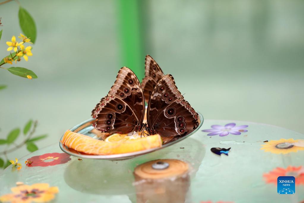 Blue morpho butterflies are seen at a zoo in Jerusalem on Oct. 12, 2021. An exhibition stepping into the world of butterflies opened this month at the zoo. (Photo by Gil Cohen Magen/Xinhua)