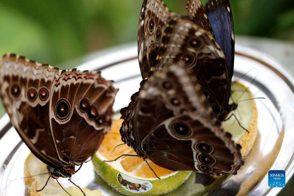 Blue morpho butterflies are seen at a zoo in Jerusalem on Oct. 12, 2021. An exhibition stepping into the world of butterflies opened this month at the zoo. (Photo by Gil Cohen Magen/Xinhua)