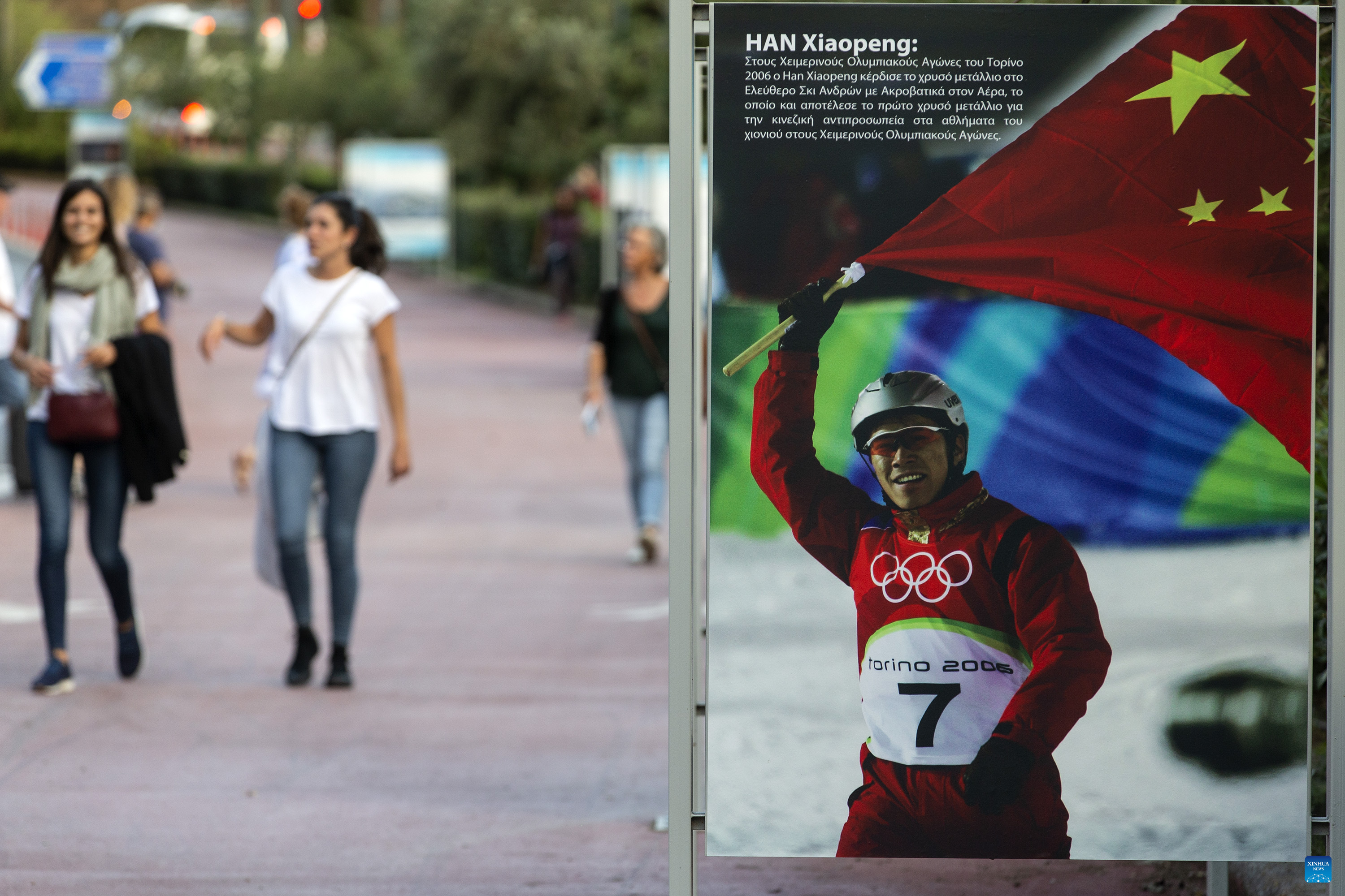 People walk on a street near the culture of the Winter Olympics of Beijing 2022 World Photography Exhibition (Greece) in Athens, Greece, Oct. 13, 2021. (Xinhua/Marios Lolos)