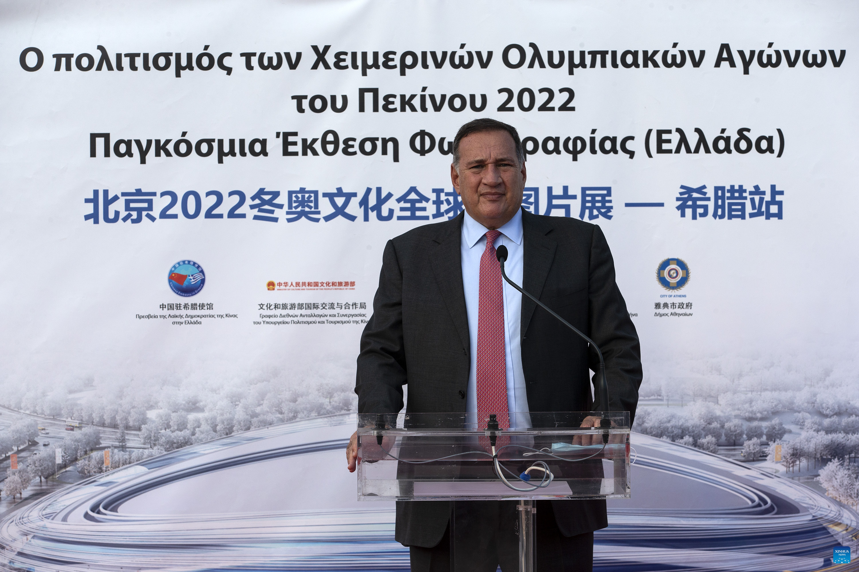 Spyros Capralos, President of the Hellenic Olympic Committee and member of the International Olympic Committee, speaks at the inauguration ceremony of the culture of the Winter Olympics of Beijing 2022 World Photography Exhibition (Greece) in Athens, Greece, Oct. 13, 2021. (Xinhua/Marios Lolos)