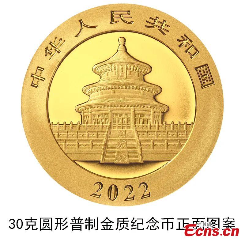 This photo shows the front side of a 30-gram panda commemorative gold coin. It has a face value of 500 yuan ($77.7). A maximum of 1,000,000 will be issued.(Photo/pbc.gov.cn)