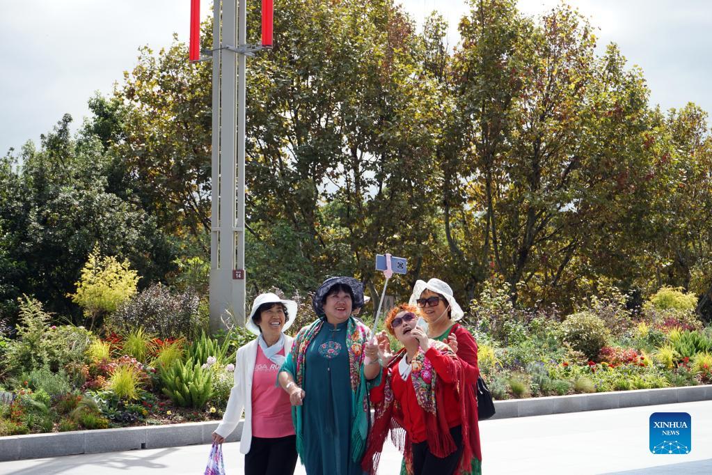 Tourists record a video clip through a mobile phone near the Dianchi Lake in Kunming, southwest China's Yunnan Province, Oct. 13, 2021. (Xinhua/Li Yahui)