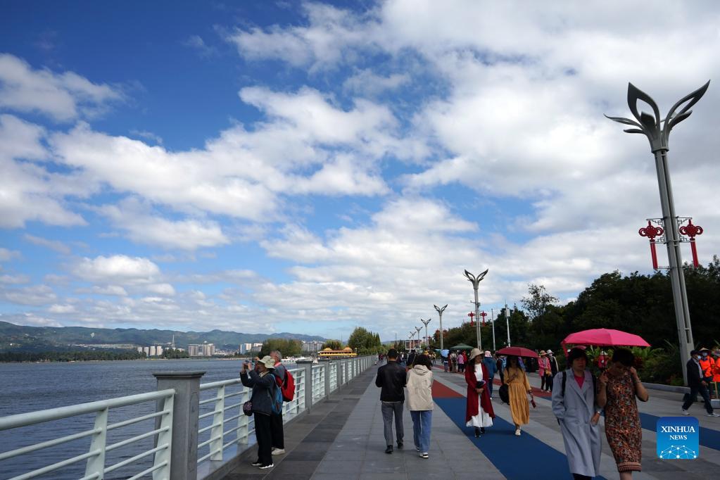 Visitors enjoy leisure time near the Dianchi Lake in Kunming, southwest China's Yunnan Province, Oct. 13, 2021. (Xinhua/Li Yahui)