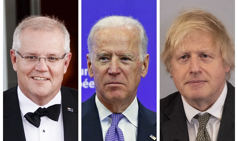 Combo photo of U.S. President Joe Biden (C), British Prime Minister Boris Johnson (R), and Australian Prime Minister Scott Morrison. (Xinhua)