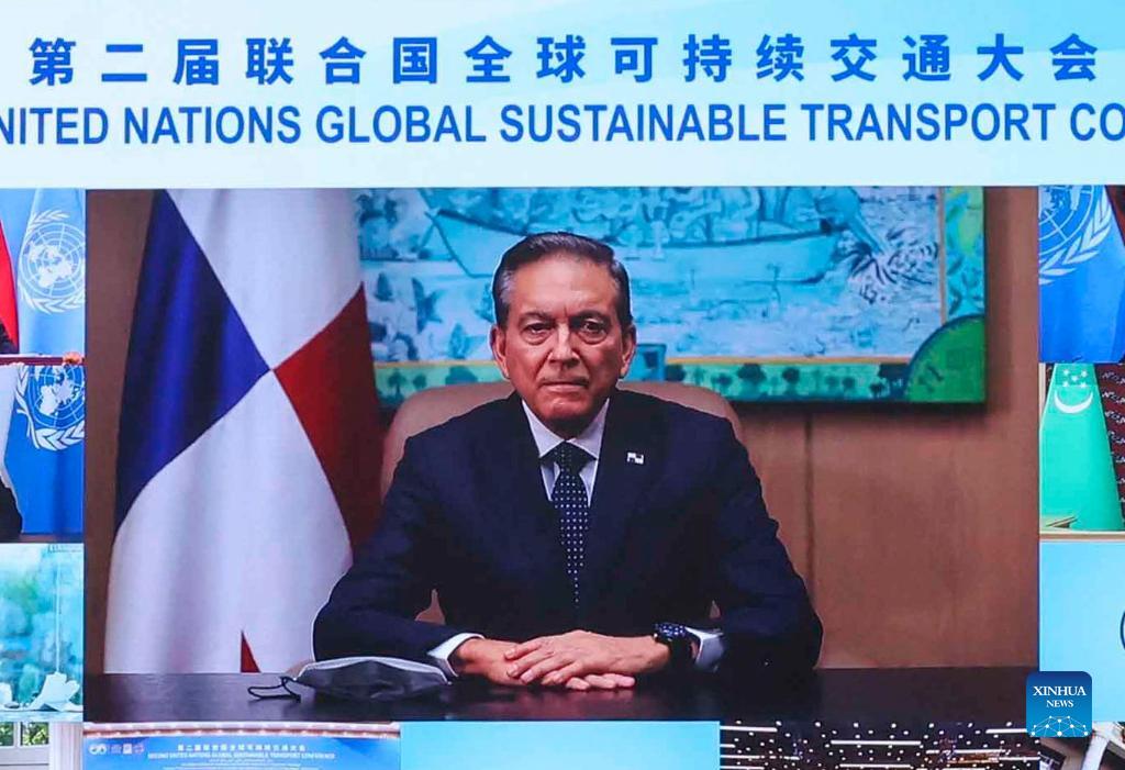Panamanian President Laurentino Cortizo speaks via video link at the opening ceremony of the Second United Nations Global Sustainable Transport Conference, Oct. 14, 2021. The Second United Nations Global Sustainable Transport Conference kicked off on Thursday in Beijing. The three-day conference will be held both online and offline. (Xinhua/Yin Gang)