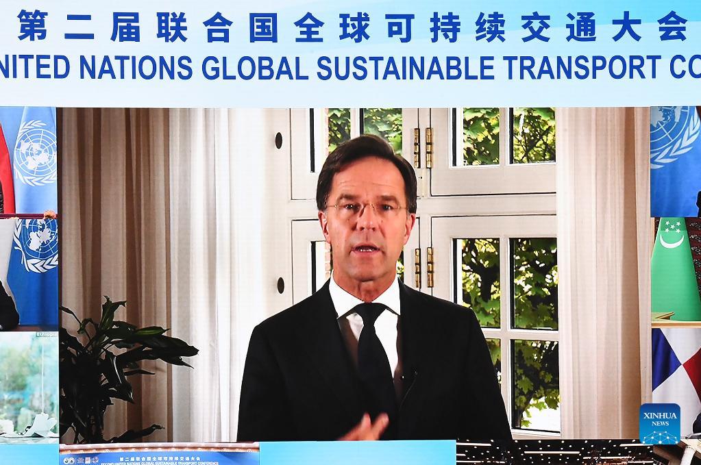 Dutch Prime Minister Mark Rutte speaks via video link at the opening ceremony of the Second United Nations Global Sustainable Transport Conference, Oct. 14, 2021. The Second United Nations Global Sustainable Transport Conference kicked off on Thursday in Beijing. The three-day conference will be held both online and offline. (Xinhua/Li He)