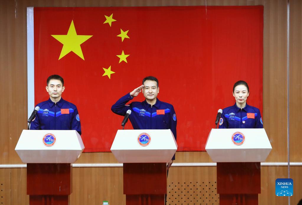 Chinese astronauts for the upcoming Shenzhou-13 mission Zhai Zhigang (C), Wang Yaping (R) and Ye Guangfu meet the press at the Jiuquan Satellite Launch Center in northwest China, Oct. 14, 2021. (Xinhua/Ju Zhenhua)