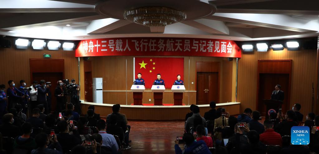 Chinese astronauts for the upcoming Shenzhou-13 mission Zhai Zhigang (C), Wang Yaping (R) and Ye Guangfu meet the press at the Jiuquan Satellite Launch Center in northwest China, Oct. 14, 2021. (Xinhua/Ju Zhenhua)