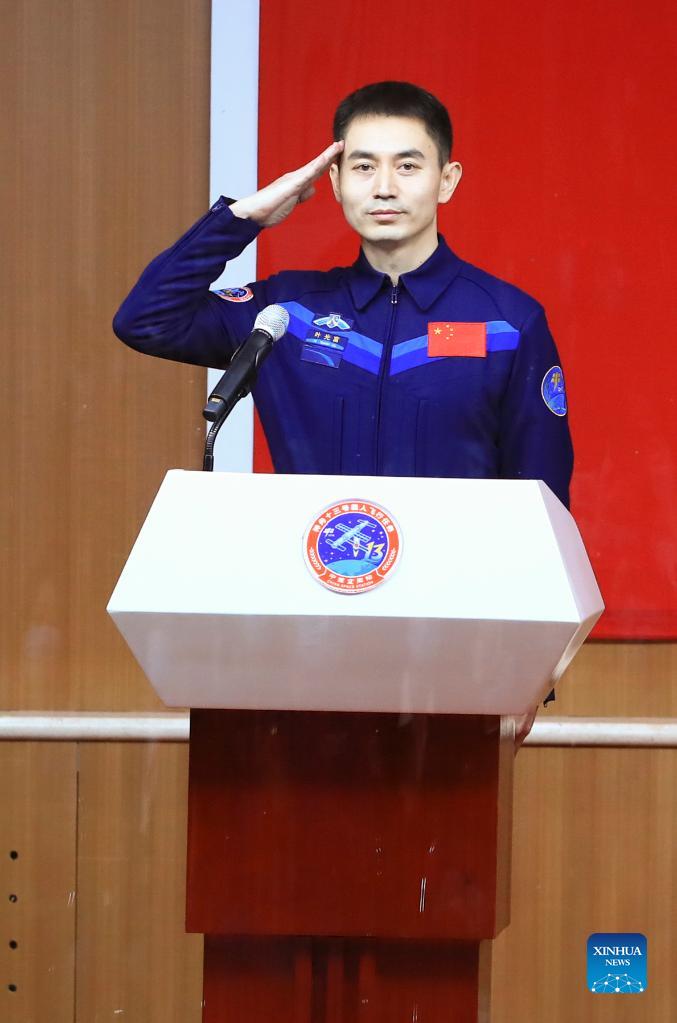 Chinese astronaut Ye Guangfu meets the press at the Jiuquan Satellite Launch Center in northwest China, Oct. 14, 2021. Zhai Zhigang, Wang Yaping and Ye Guangfu, the three Chinese astronauts for the upcoming Shenzhou-13 mission, met the press on Thursday. (Xinhua/Ju Zhenhua)