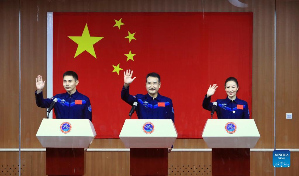 JIUQUAN, Oct. 14 (Xinhua) -- Zhai Zhigang, Wang Yaping and Ye Guangfu, the three Chinese astronauts for the upcoming Shenzhou-13 mission, met the press on Thursday.