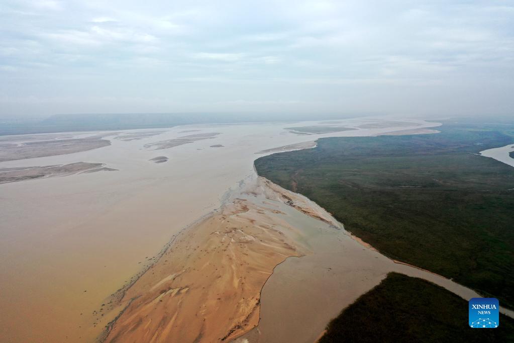 Aerial photo taken on Oct. 14, 2021 shows the confluence of the Yellow River and Fenhe River in Miaoqian Village of Wanrong County, Yuncheng, north China's Shanxi Province. The water level of Hejin section of the Fenhe River in Yuncheng has dropped to 376.39 meters. (Xinhua/Zhan Yan)