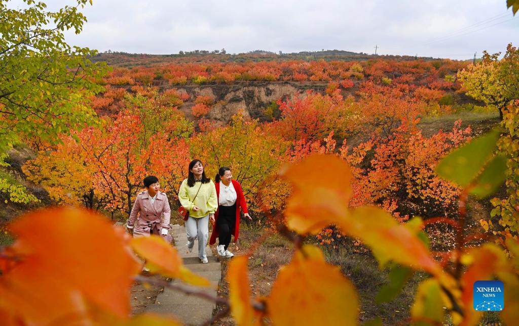 Photo taken on Oct. 14, 2021 shows visitors enjoying the red leaves in Hanjialiang Village of Guta Town, Yulin City, northwest China's Shaanxi Province. (Xinhua/Tao Ming)