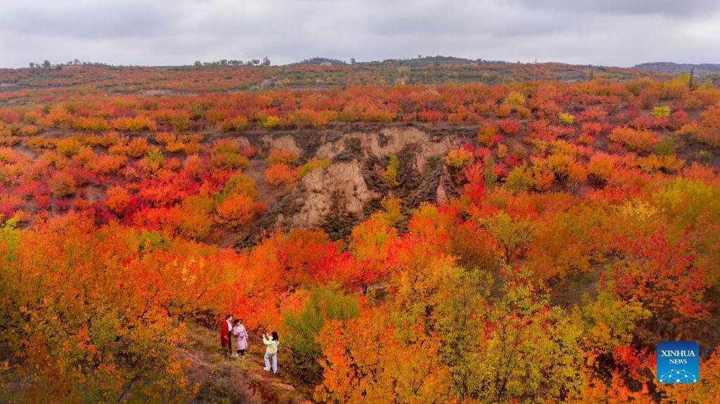 Aerial photo taken on Oct. 14, 2021 shows visitors enjoying the red leaves in Hanjialiang Village of Guta Town, Yulin City, northwest China's Shaanxi Province. (Xinhua/Tao Ming)