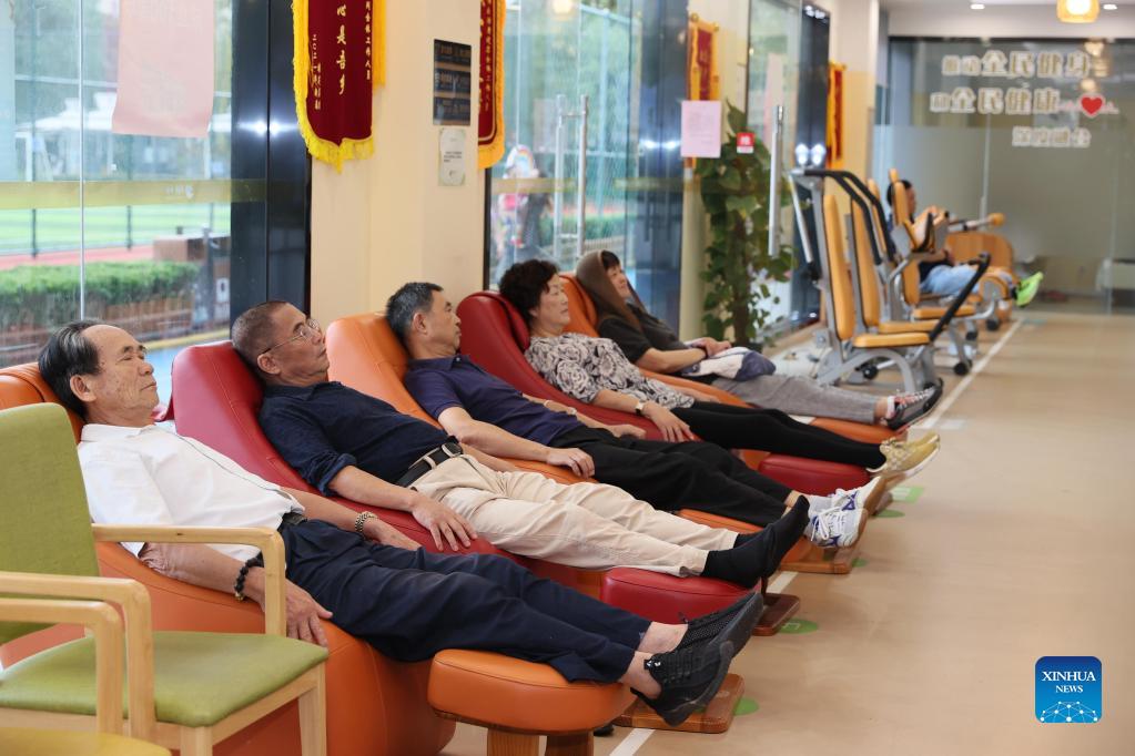 Elders relax on massage sofas at a senior care center in Xuhui District of Shanghai, east China, Oct. 13, 2021. Named "Sports and Health Home for Elders", the senior care center is a multi-functional fitness place for the elderly. It provides elders with "one-stop" services such as physical fitness test, basic health test and scientific fitness guidance, etc. (Xinhua/Wang Xiang)