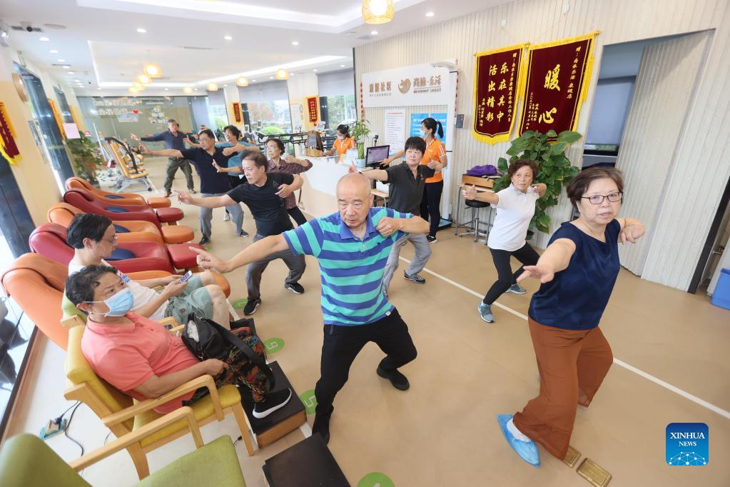 Elders exercise at a senior care center in Xuhui District of Shanghai, east China, Oct. 13, 2021. Named "Sports and Health Home for Elders", the senior care center is a multi-functional fitness place for the elderly. It provides elders with "one-stop" services such as physical fitness test, basic health test and scientific fitness guidance, etc. (Xinhua/Wang Xiang)