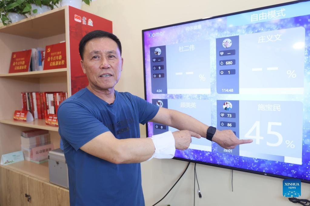 Citizen Shi Baomin introduces exercise indicators displayed on a screen at a senior care center in Xuhui District of Shanghai, east China, Oct. 13, 2021. Named "Sports and Health Home for Elders", the senior care center is a multi-functional fitness place for the elderly. It provides elders with "one-stop" services such as physical fitness test, basic health test and scientific fitness guidance, etc. (Xinhua/Wang Xiang)