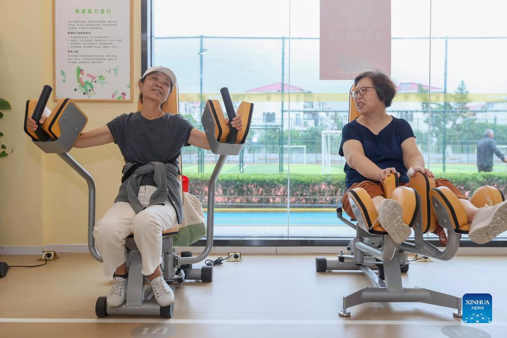 Elders chat while exercising at a senior care center in Xuhui District of Shanghai, east China, Oct. 13, 2021. Named "Sports and Health Home for Elders", the senior care center is a multi-functional fitness place for the elderly. It provides elders with "one-stop" services such as physical fitness test, basic health test and scientific fitness guidance, etc. (Xinhua/Wang Xiang)