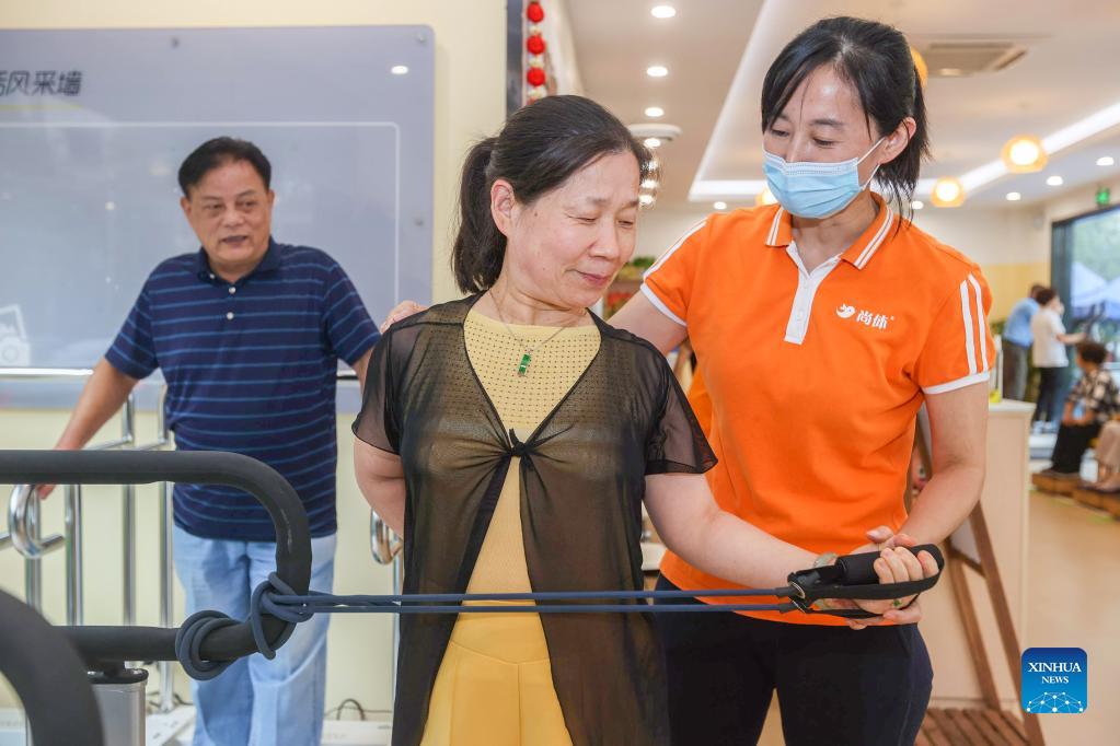 A staff member instructs an elder lady to carry out stretching training at a senior care center in Xuhui District of Shanghai, east China, Oct. 13, 2021. Named "Sports and Health Home for Elders", the senior care center is a multi-functional fitness place for the elderly. It provides elders with "one-stop" services such as physical fitness test, basic health test and scientific fitness guidance, etc. (Xinhua/Wang Xiang)