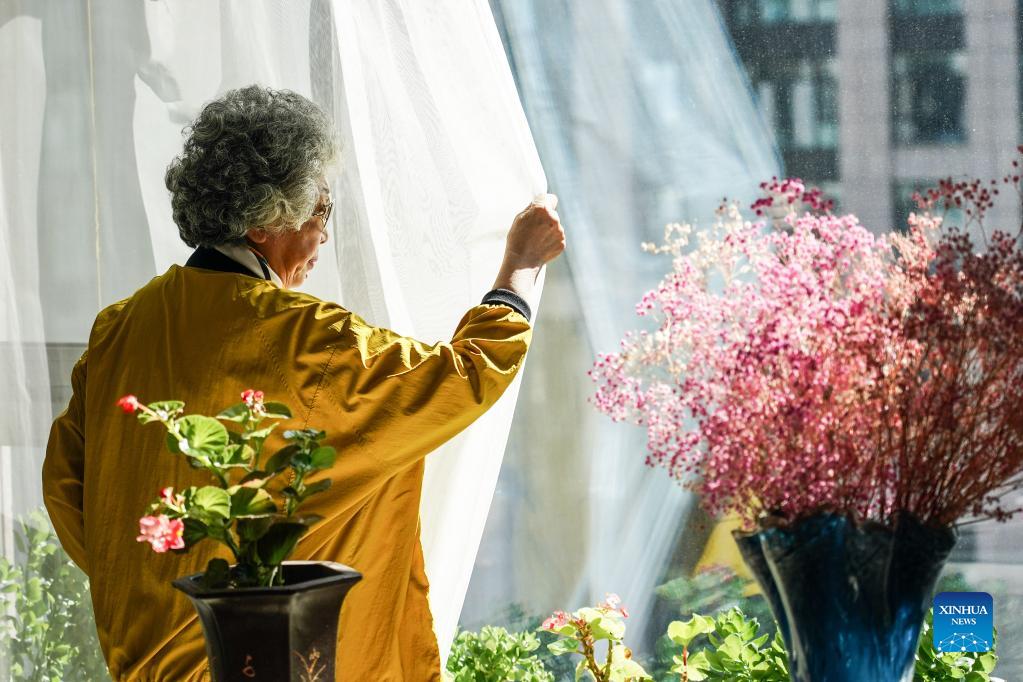 Li Zhanping pulls the curtain at home in Beijing, capital of China, before heading to the nursing center, Oct. 11, 2021. In recent years, many senior people in Beijing choose to spend their elderly life at nursing houses in other surrounding cities. Three years ago, the 80-year-old Beijinger Lyu Weiye, together with his wife Li Zhanping, decided to rest their remaining years at a nursing institution in Hebei Province, which is located only 30 kilometers away from Beijing. Now they live a very comfortable life between the two cities, enjoying the medical services at the nursing institution as well as gathering with their old friends in Beijing. (Xinhua/Peng Ziyang)