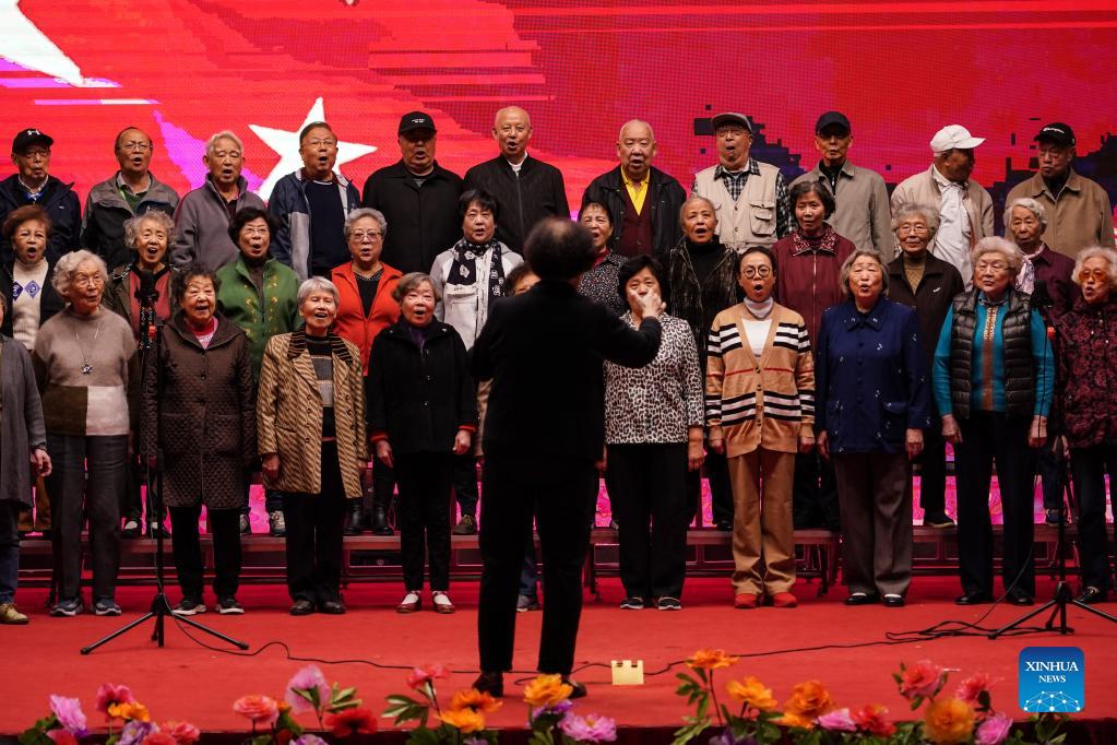 Elderly people perform chorus on the stage at Yanda Golden Age Health Nursing Center in north China's Hebei Province, Oct. 11, 2021. In recent years, many senior people in Beijing choose to spend their elderly life at nursing houses in other surrounding cities. Three years ago, the 80-year-old Beijinger Lyu Weiye, together with his wife Li Zhanping, decided to rest their remaining years at a nursing institution in Hebei Province, which is located only 30 kilometers away from Beijing. Now they live a very comfortable life between the two cities, enjoying the medical services at the nursing institution as well as gathering with their old friends in Beijing. (Xinhua/Peng Ziyang)