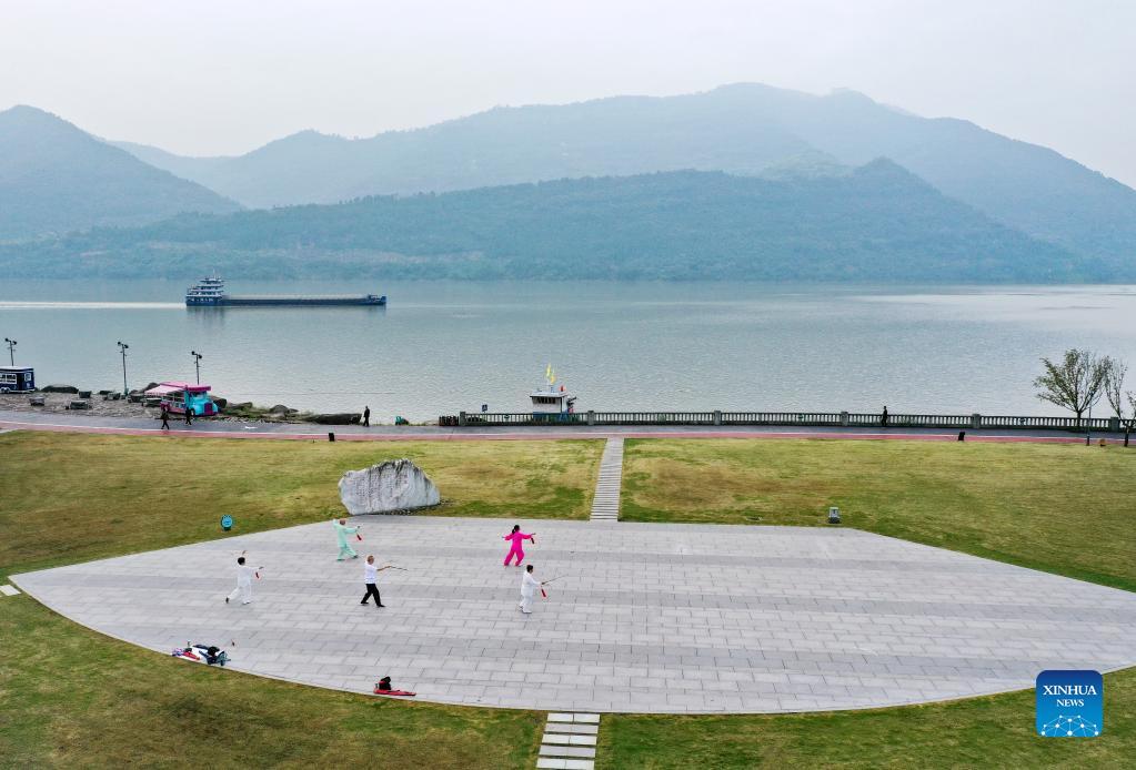 Aerial photo shows people exercising at a waterside park in southwest China's Chongqing, Oct. 14, 2021. A 33km waterside walkway, which links six areas and eight parks in different themes along two rivers, was built in Yunyang district of Chongqing, providing residents a nice place to spend their leisure time. (Xinhua/Wang Quanchao)