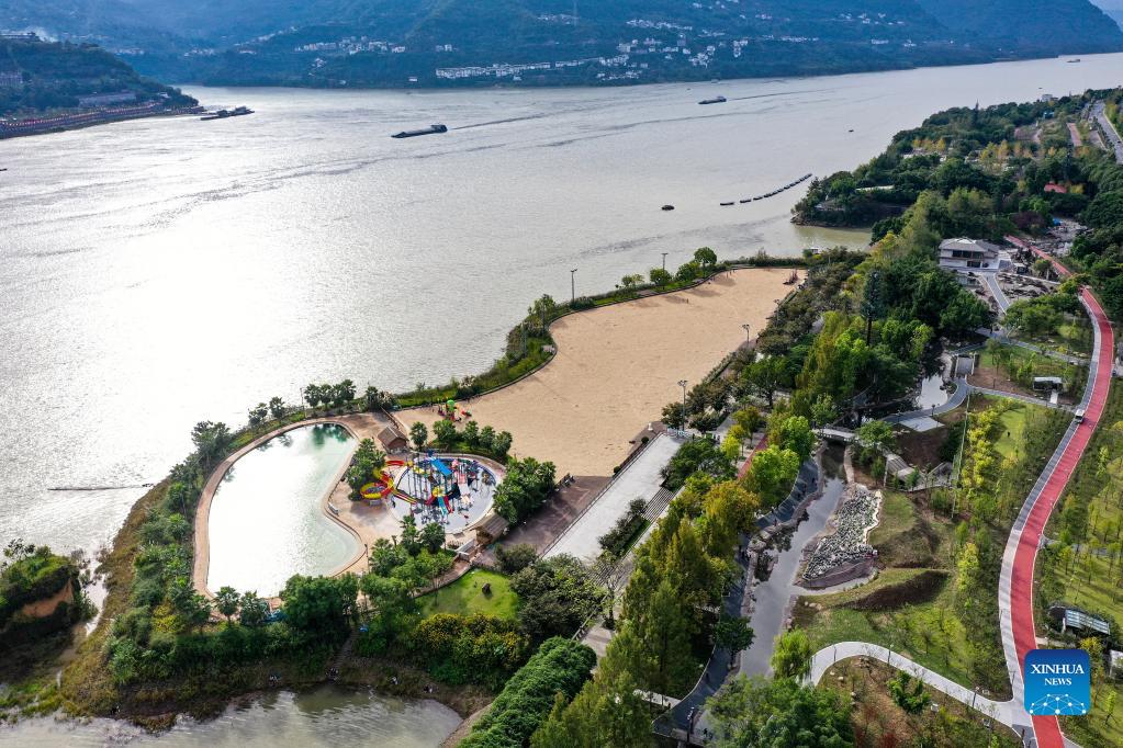 Aerial photo taken on Oct. 13, 2021 shows the view of a waterside park in southwest China's Chongqing. A 33km waterside walkway, which links six areas and eight parks in different themes along two rivers, was built in Yunyang district of Chongqing, providing residents a nice place to spend their leisure time. (Xinhua/Wang Quanchao)