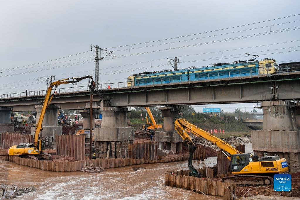 Constructors work at the repair site of Changyuan River Bridge on Nantongpu Railway in Qixian County, north China's Shanxi Province, Oct. 13, 2021. The traffic on Changyuan River Bridge of Nantongpu Railway, which was disrupted due to continuous rainstorms, resumed in both directions Thursday morning after a rush repair. (Xinhua/Cao Yang)