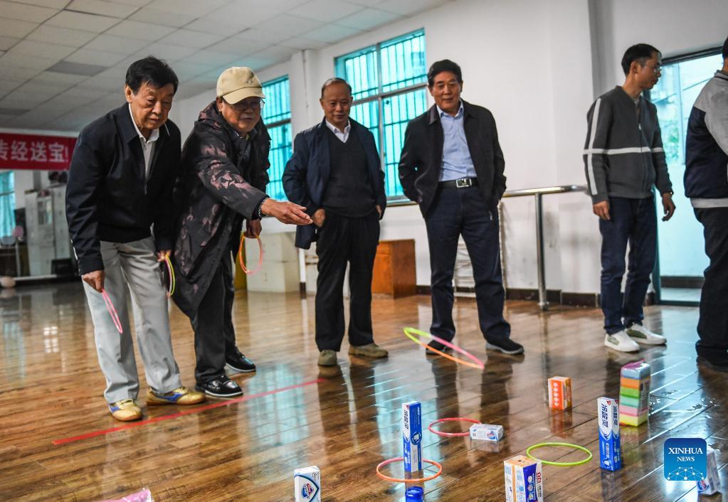 Elders play a game at a university for senior citizens of Zhongshan District in Liupanshui, southwest China's Guizhou Province, Oct. 14, 2021. Various activities are carried out in the district to celebrate the Double Ninth Festival or the Chongyang Festival for the elders. The festival, celebrated throughout China on the ninth day of the ninth month on the Chinese lunar calendar, is an occasion to care for and send blessings to the elderly. (Xinhua/Tao Liang)