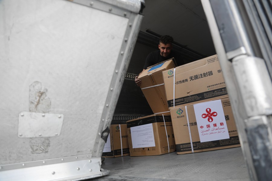 A worker transports China-donated syringes at Baghdad International Airport in Iraq on October. 14, 2021. (Xinhua photo)